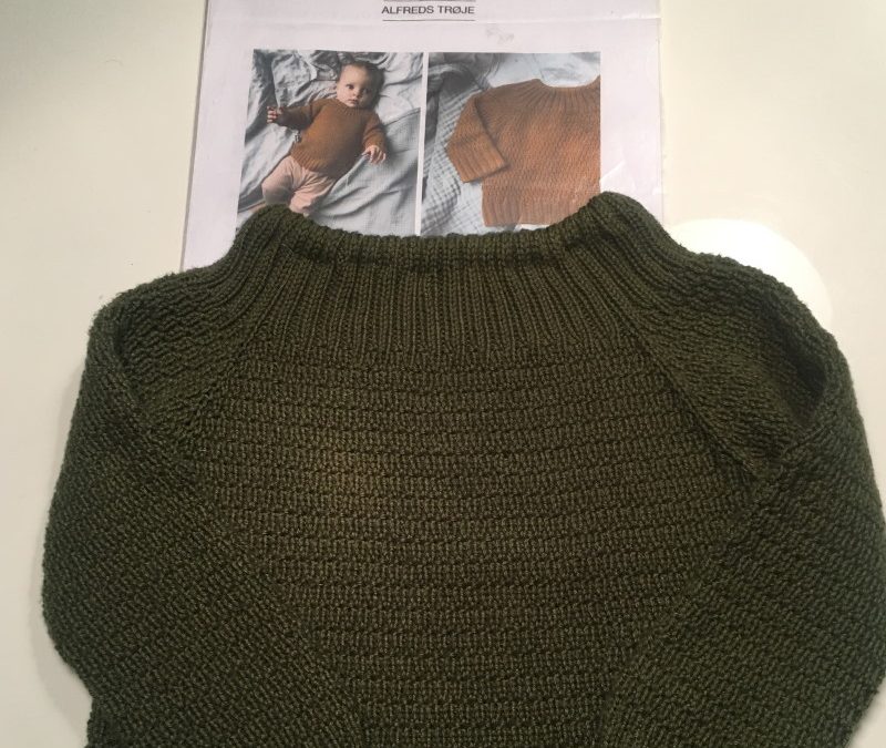 ALFREDS TRØJE som til lille Hugo er strikket i størrelse 2-3 år – men her valgt at strikke den i en lækker bomuld 8/4 på pind 2½